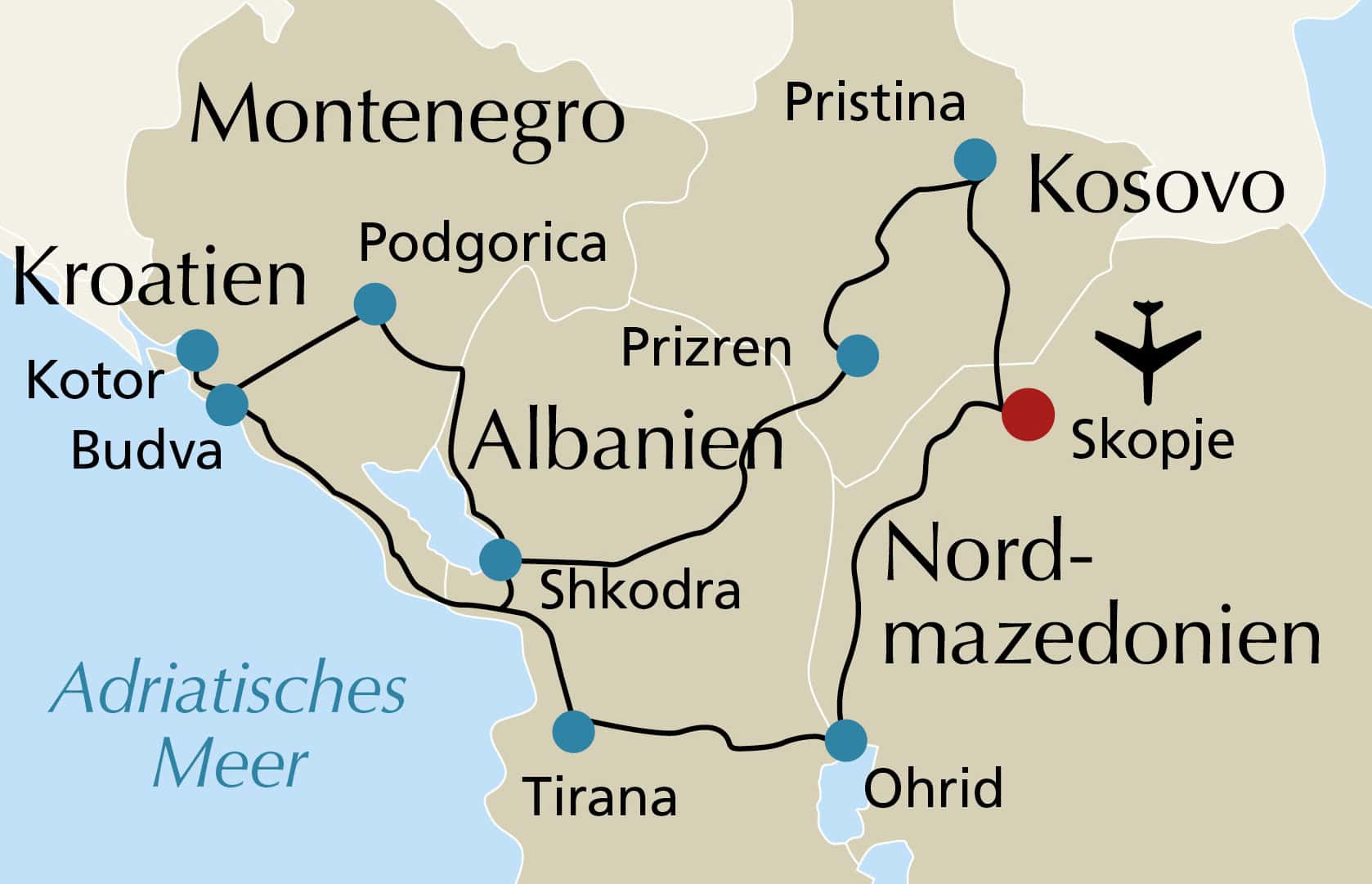 Albanien: Tirana | Kosovo: Pristina | Montenegro: Podgorica | Nord Mazedonien: Skopje